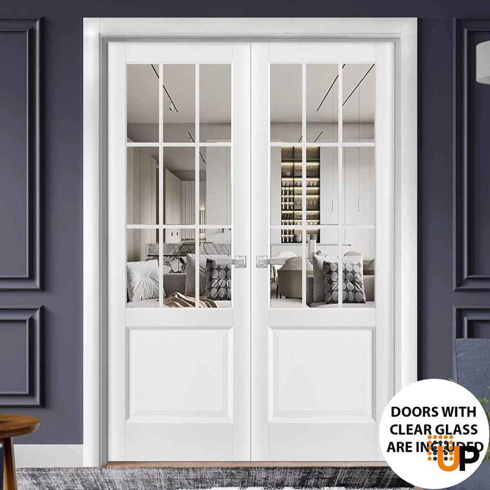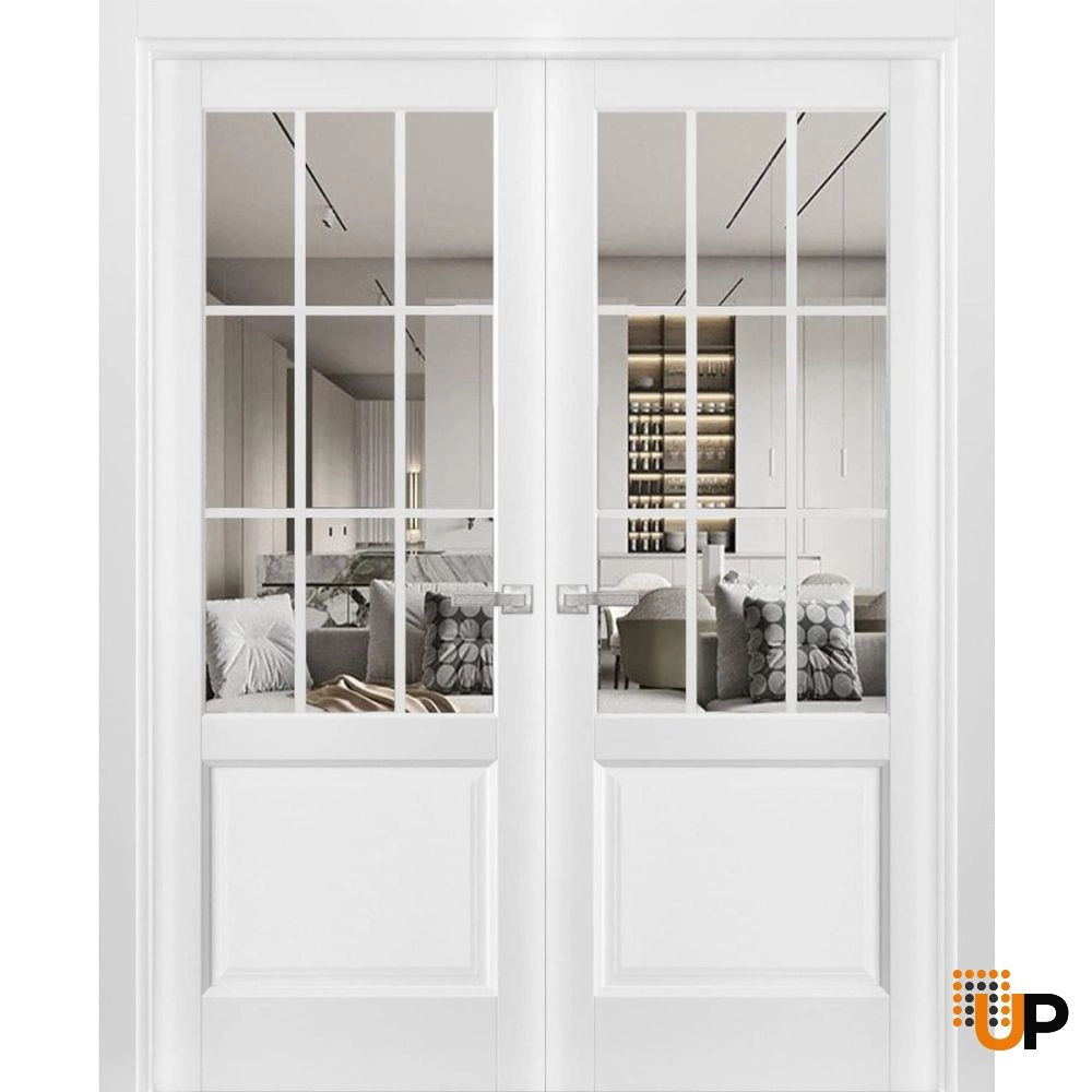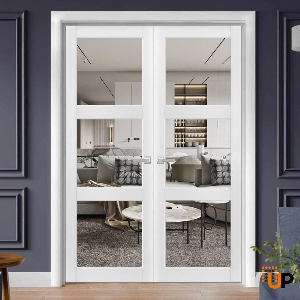Introducing the elegant “Modern French Doors” from the Lucia collection, designed to add a touch of sophistication and style to your home’s interior. Made from high-quality wood with a solid core construction, these doors are built to last and withstand the test of time. The white color adds a touch of elegance and refinement to any room, while the 3-panel clear glass design allows natural light to flow through and brighten up your space.